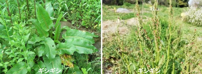 ギシギシはタデ科の多年草です。その特徴的な名前の由来は諸説ありますが、茎をこすり合わせるとギシギシという音がすることから名付けられたのではと言われています。ギシギシは暖かくなるとともにぐんぐん成長し、種類にもよりますが40~120センチほどの背丈になります。5〜8月ごろに花を咲かせ、その後実をつけてたくさんの種を落とします。そのあとは根に栄養分を蓄え、小さな葉をロゼット状(※)に広げた状態で越冬します。姿形が似ている雑草でスイバというものがあります。茎が酸っぱく、子供の頃に道端のスイバの茎をかじった覚えがあります。見た目はギシギシと似ていますが、こちらはギシギシよりも背が低く、葉の付け根が矢じりのように尖っているのが特徴です。ギシギシは繁殖力が旺盛で、畑の害悪雑草として有名です。まずは種子数が多く、1株あたり1万粒もの種を落とすと言われています。また種子寿命もとても長く、20年以上土壌中に埋まっていても地表に出てくるとまた発芽するという報告もあるようです。その年にギシギシのタネがその畑に落ちないようにしていても、昔落ちたタネが、耕すことで地表に上がってくることでまた発芽するということもあるためとても厄介です。またギシギシは地上部分を刈り取っても、根の上部が残っているとまたそこから芽を出してきます。トラクターなどで耕すとその根が畑中に広がり、余計にギシギシが増えてしまうということもあるので要注意です。
