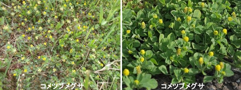 コメツブツメクサ(米粒詰草)は、日当たりのよい乾燥した場所を好む1年草です。草丈は10センチメートルから30センチメートルほどですが、株元から盛んに枝分かれをします。また、多数の株がびっしりと密集するように生える傾向があり、その姿はまるでマットを広げたかのように見えます。春から夏にかけて、黄色い花を次々と咲かせます。花は5個から20個ずつ丸く集まってつき、直径1センチメートル程度の「黄色い花の球」となります。これがまるで米粒のように見えることが名前の由来となっています。そのほか、コゴメツメクサ、キバナツメクサなどの別名もあります。コメツブツメクサの花は、咲き終わると「干からびた残骸」のようになって、いつまで経っても結実しないように見えます。じつはこの仲間の果実には、枯れた花びらに包まれながら成熟していくという特徴があります。そのため、花びらの残骸部分をそっとめくってみると、ちゃんと中に小さな果実が育っているのを確認できます。果実は成熟すると割れて、中から小さなタネがこぼれ落ちます。小さな草ですが、まるでマットを広げたかのようにびっしりと広がる傾向があります。そのため同じような環境を好む在来植物の生育場所を奪ってしまう可能性があります。