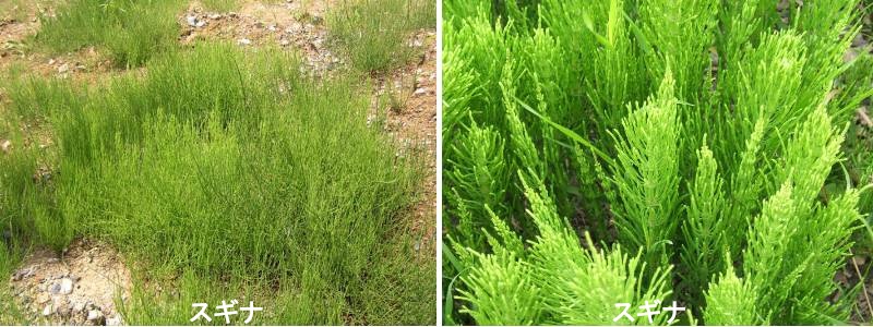 春になると満開のサクラが注目されますが、河川敷や土手、道端などに眼を向ければ、とても地味な土筆(ツクシ)が所々に見られます。ツクシはスギナという植物の一部分ですが、残念ながら花はありません。ツクシは早春に芽を出すスギナの胞子茎です。茎は柔らかな円柱状で退化した「はかま」と呼ばれる葉(葉鞘)が節に付いています。薄茶色で丈は10~15cm程度です。おひたしや佃煮などにしてよく食べた思い出のある方も多いと思います。スギナはトクサ科の耐寒性の多年生草本で、ツクシが枯れた後に芽を出します。草丈は30~40cmになり、中空の円柱状で、節で輪生状に多数分岐します。緑色の葉は小さく鱗片状です。スギナは栄養茎として養分の調達を、ツクシは胞子茎として繁殖をそれぞれ分担しています。和名のスギナは草の形がスギに似ているから、杉菜と名がついたという説や、節のところで抜いて継ぐことができたことから、継ぐ菜から転訛したという説があります。本草綱目には、節と節とが互いに接しているので接続草として登場します。薬用としては、5~7月に全草を採取し、水洗いしてから天日で乾燥させます。これを生薬のモンケイ(問荊)といいます。腎臓炎、利尿、肋膜炎、去痰、膀胱炎、回虫駆除などに、モンケイの煎じ液を服用します。また、皮膚疾患や漆かぶれには外用として用いられます。