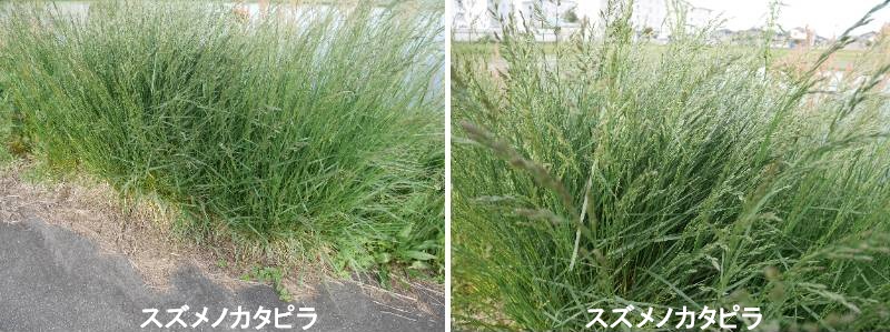 スズメノカタビラは、道ばたや人家の周囲、空き地、畑地などの至るところに生育します。スズメノテッポウとともに春の畑地の代表的な強害草であり、繁殖力が盛んで、一面に群落をつくることがあります。根は浅いですが、株になるので除去が難しい雑草です。茎は平たく、根もとで多く分かれて株になり、葉は細い線形で柔らかく、少し光沢があり、先は急にとがっています。2月頃から夏まで茎の先に淡緑色で卵形の花をつけます。暖地の日当たりのよい場所では、冬の間でも花が咲くので、よく目立つ草です。秋に発芽し、越冬して翌春にかけて生育する一年生冬雑草。主に秋から春に発生し、生育とともに分げつが進み、株を形成して越冬します。その後、春から初夏3月~6月にかけて開花して、結実後は一年生の草種であるため株は枯死します。 また、条件が整えば、春以降でも次々に発生が見られるとともに、小さな個体でも開花します。暖地では極寒気を除いてほぼ一年中花が見られます。スズメノカタビラは世界に500種ほどを含むイチゴツナギ属の一年生イネ科植物で、イチゴツナギ属植物の花序の枝梗は、逆向きの細かな小刺針によってざらついており、子供がその枝梗にヘビイチゴを串刺しにして遊んだことが属名苺繋ぎの語源とされています。種小名のスズメノカタビラは、小さなものを表す接頭語のスズメノに裏地のない単衣の衣を意味するカタビラを併せたものであり、半透明の頴外縁を着物の襟に見立ててます。