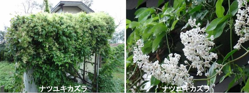 ナツユキカズラは、つる性で、初夏から秋まで長期間、白い花をまるで雪のように株いっぱいに咲かせます。花の咲き方にクセというかムラがあるようで、季節や年によっては一斉に咲かずパラパラと咲き続けたりします。葉は厚みが薄い緩いハート型、幹はちょっとした場所でも巻きつきますが吸着性はありません。丈夫ですぐ大きくなり短期間の緑化にも向いていますが、その分維持管理が難しいです。日当たりと水はけのよい場所に植えます。写真のように株いっぱいに咲かせるには全日の日当たりが欲しいです。とても丈夫で上記の条件以外にはこだわらずよく育ちます。むしろ誘引や剪定などの管理が大変です。基本的に落葉期に剪定しますが、それだけでは足りないので気になったときにいつでも剪定します。花芽がある初夏はなるべく刈り込まないほうがいいでしょう。伸びすぎたらその年の花つきは犠牲にして、冬に一気に切り戻して更新します。洋風や自然風の庭に合います。つる性の性質を生かして、建物やフェンスなどに絡ませるとよいでしょう。小さなトレリスや樹木などに絡ませると収拾がつかなくなるのですすめません。とても丈夫で広がるのも早いですが、それが扱いにくさにつながっています。管理できる腕と時間の持てる人向けの花です。