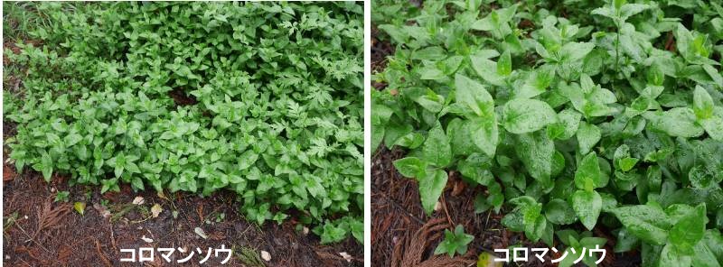 コロマンソウはキツネノマゴ科アシスタシア属の観賞用の栽培種です。ツノグサが標準和名ですが、あまり一般的でなく、コロマンソウとしました。日当たりの良い草地に生える多年生草で草丈は50~100cm程度になります。本来栽培種ですが、野生化した物が多く見られます。茎はやや四角形で縦条があり、多数分岐し、節部から下根して広がり、時に一面の群生が見られます。葉は対生し、卵形~広卵形、先は尖り、基部は広い円形~切形、縁はやや波状縁になっています。葉柄は2cm程度で、花は葉腋の花序に5~13花、淡紅紫色又は白色で基部は円筒形で先は5裂します。