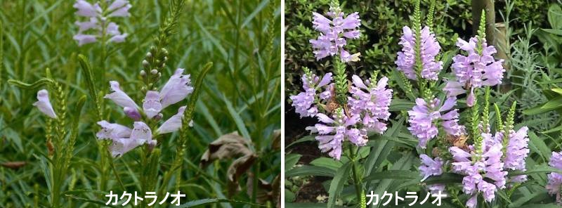 フィソステギア(カクトラノオ)とは北アメリカ東北部原産、毎年花を咲かせる多年草です。フィソステギアは約15種の仲間が知られていますが、おもに園芸で栽培されているのは、フィソステギア・バージニアナという種です。繁殖力が旺盛で地下茎を伸ばして増えていきます。地下茎からはたくさんの茎を伸ばしますが、地上を伸びる茎はあまり枝分かれしません。葉っぱは細長い楕円形でフチにぎざぎざが入ります。茎を挟んで左右にでて、一段ごとに90°回転しながら生えるので、よく見るとすごく行儀よく見えます。 茎は断面が四角く、和名のカクトラノオ(角虎の尾)はそこに由来します。「虎の尾」は花穂を虎のしっぽに見立てたものです。ちなみに、属名のフィソステギアはフィサ(袋状)とステゲ(覆い)に由来し、果実を覆うように付く萼にちなむと言われています。夏~秋に花穂を伸ばして白や淡~濃ピンク、青みを帯びた紫色の花を密に咲かせます。花は筒型で横向きに咲き、つぼみは下から上に咲き進んでいき、最期の方は花穂がかなり長くなっています。冬は茎葉が枯れて、根と芽の状態で越します。日本に入ってきたのは明治末~大正時代と言われています。強健な植物で、場所が合えば手間もかからないので公園の花壇などにも利用されます。また、切り花にも向きます。