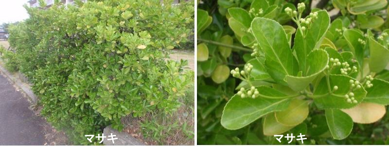 マサキは、日照不足や乾燥、塩害、煙害、刈り込みに強く、生垣や街路樹などに用いられる常緑低木です。葉は楕円形~倒卵形で厚ぼったくツヤがあります。葉縁には緩い鋸歯が入ります。「キンマサキ」などの斑入り葉も多く出回ります。葉が密生するので刈り込みを繰り返せば遮蔽性のある生垣になります。初夏に淡緑色の花を咲かせますが地味で目立ちません。秋にはオレンジ色の実をつけます。自然樹形は下部からよく枝分かれしてこんもりします。以前はよく植えられていましたが、近年は病害虫が目立つなどの理由で使用頻度は少なくなっています。しかし、上手に管理・剪定された生垣は遮蔽効果や美観の点で優れています。日当たりのよい場所が適地ですが、半日陰でも育ちます。乾湿両方に耐えるのであまり土壌は選びませんが、肥沃で水はけのよい場所を好みます。綺麗に育てるなら、きちんと剪定することと、病害虫に注意する必要があります。耐潮性があるので潮風の当たりやすい場所でも耐えて生育します。成長が早いので、年2回あるいは3回程度刈り込みます。条件がそれほど良くない場所に植栽している場合は病害虫の駆除をしっかり行います。適期は上記ですが、花や実を期待する樹木ではないので、冬季と新芽展開時を除けば時期を気にせず刈り込めます。