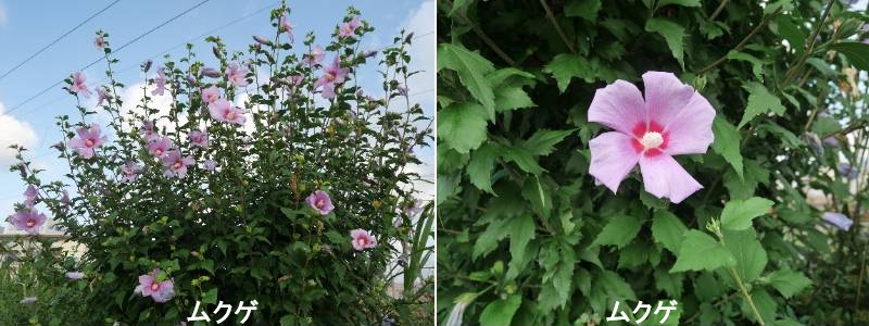 ムクゲは、アオイ科フヨウ属(ハイビスカス属)に属する落葉性低木です。原産地は、中国で、中国名は「木槿」(ムーチン)といい、ここから転じて「ムクゲ」と呼ばれています。別名を「ハチス」とも言われています。「槿花一朝の夢」とは、一日だけの栄華をムクゲの花にたとえたもので、他のフヨウ属と同様に朝開いて夕方にはしぼむ一日花で、朝開暮落花の別名もあります。しかし、生長する枝の葉腋に次々とつぼみをつけるため、花期は長く、梅雨明けから9月まで、次々と咲き続けます。もともと日本に産するフヨウ属には、ハマボウ、モクフヨウ、ブッソウゲなどがありますが、いずれも暖地性の植物で、これらに比べるとムクゲが最も耐寒力があります。刈り込みに強く、よく分枝するので、生垣に多く使われています。また、丈夫で放任しておいてもまとまった樹形を作るので、庭の花木として植えられています。そのほか、最近では、矮化剤を使った鉢物も市販されています。古くから栽培され、親しまれてきた花木ですが、品種名がはっきりしたものは少なく、最も普通に見られるのは、紫紅色で5弁の一重咲きで、花弁の底部が濃紅色の、いわゆる底紅咲きといわれているものです。白色花弁で底部だけが鮮やかな紅色の一重咲きの「日の丸」だけが園芸品種名らしい名前がついています。茶人・宗旦が愛した花といわれ、別名・宗旦ムクゲといわれ、この品種だけが茶花として珍重されています。