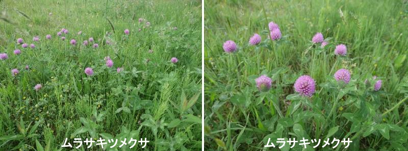 シロツメクサと同じ仲間ですが、葉は大きく、茎は立ちあがります。茎の先端に赤紫色の丸い花の穂がつきます。英語では、シロツメクサのホワイトクローバーに対し、アカツメクサはレッドクローバーと言います。花期は長く、春から秋にかけてだらだらと咲き続けます。市内では、新しく土地を造成した場所や、土手の草地に特に多く見られます。モンキチョウやベニシジミなど、さまざまな昆虫が花の蜜や花粉を求めてやってきます。葉に模様が入る株がありますが、その模様は株ごとに微妙に異なります。また、花色は赤紫色が基本ですが、その濃淡や色調は株によってだいぶ異なります。4つ葉もできますが、シロツメクサのそれと比べとはるかにレアなものです。アカツメクサ(ムラサキツメクサ)は、シロツメクサの仲間で赤紫色の花を咲かせることから名前の由来になっています。しかしたまに白い花を咲かせる株も存在し、市内でも見ることができます。これをシロバナアカツメクサ、またはセッカツメクサと言います。アカツメクサなのに白花とはなんとも紛らわしいのですが、花色がちがうだけで他の特徴はアカツメクサと同じです。