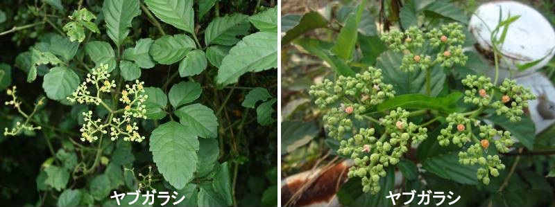 ヤブガラシは至る所の空き地にはびこる迷惑雑草です。この草が繁茂すると、その土地の養分を吸収し、付近の藪を枯らしてしまうというのでヤブガラシと言われるとのことです。当地では、貧乏蔓等と言って嫌われております。おそらく庭がヤブガラシに覆われているような家は、貧乏暇なしで、除草をするゆとりもない貧乏人の家だ、ぐらいの意味合いなのでしょう。しかしその花はよく見ると面白い形をしていて、子どもの頃には、ロウソクバナと言っていたように記憶しています。この花を見ると、子どもの頃の夏が思い出され、夏の気分が盛り上がる花です。花序は扁平な集散花序で、4個の花弁は淡緑色で、平たく開き、後には反転します。雄しべは4個です。すぐに花弁と雄しべが落ちてしまうので、あとには雌しべだけが花盤に取り残されることになります。この姿が、花盤の色とも相まって燭台に蝋燭を立てたようにように見えます。ロウソクバナの所以でしょう。花弁のある間は、雄しべが着いていますので、雄花の働きをし、花弁の落ちたあと(雄しべも落ちている)で雌しべが成熟して雌花の働きをして、自花受粉を避けているもののようです。週刊朝日百科植物の世界(朝日新聞社)37巻には、「花は自家不和合性であるために結実率は低い。」とあります。