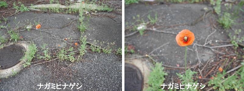 ナガミヒナゲシは和名で「長実雛芥子」と表記します。「雛」には「小さくてかわいらしい」という意味があるように、ナガミヒナゲシは丸みのある淡赤色の花を咲かせるのが特徴です。細長い果実の中には、けし粒大の種が約1600粒も入っていて、1個体が約100個の果実をつけるので、多い個体は15~17万粒の種を持ちます。種は秋に発芽し、ロゼット状態で越冬するものと翌春に発芽するものがあります。ナガミヒナゲシは「特定外来生物による生態系等に係る被害の防止に関する法律(外来生物法)」の指定はされていませんが、繁殖力が強く、繁茂・群生することにより在来植物に影響を及ぼします。可憐でかわいらしい花ですが、繁殖力が強い「雑草」としての一面も持ち合わせているのです。ちょうど梅雨にあたる6月頃に種がこぼれ落ちます。雨で濡れたタイヤや靴裏に種がくっ付き、道路沿いのあちこちに落下することで、分布範囲を拡大させています。