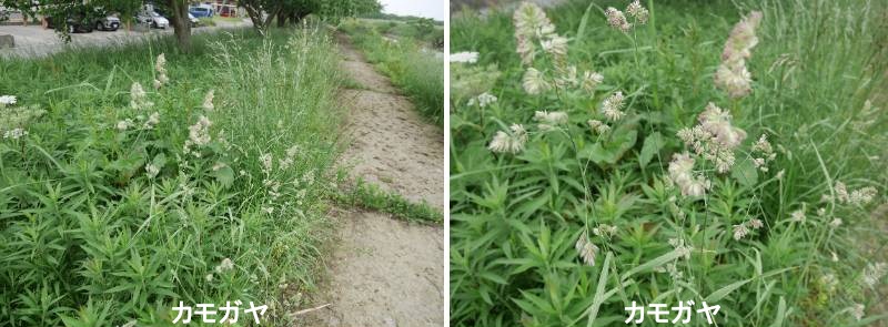 カモガヤ(鴨茅)は、ヨーロッパ原産の多年草で、オーチャードグラスとも呼ばれています。牧草として広く利用されているほか、のり面緑化やゴルフ場の芝生などにも用いられることもあります。繁殖力・環境適応力ともに強く、各地で野生化して繁茂しています。日本の侵略的外来種ワースト100にも選定されています。花期は初夏が中心ですが、環境によっては季節に関係なく穂を出すこともあります。開花期の穂は雄しべの葯(花粉が入る袋)が多数ぶら下がり、揺すると煙のように大量の花粉が立ち上ります。イネ科花粉症の原因植物の筆頭に挙げられています。英語では、穂のかたちをニワトリの足に見立ててcock’s