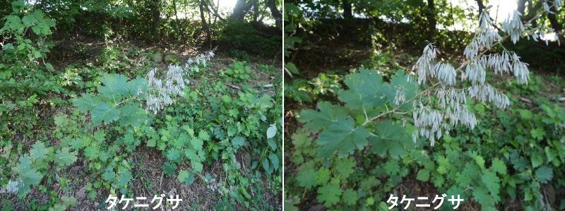 竹煮草(タケニグサ)は、宇奈月の山地の日当たりのいい荒れ地に生え、高さ1mから2mにもなるケシ科の大形多年草です。竹と一緒に煮ると竹が柔らかくなり、細工しやすくなることが名前の由来となっています。茎頂に白い小花を多数つけた円錐花序を作り、白色の2個の蕚片は開花時に落下します。葉は、掌状に深く切れ込んだ広卵形で互生し、裏面は、毛が密生し白くなり葉柄があります。茎を切ると有毒の黄色の乳液が出てきます。この有毒成分はプロトビンなどのアルカイロイドで、皮膚の炎症などを引きおこします。外用として皮膚病等に効き目があります。山が荒れはじめると竹煮草が増えるようです。富山県水墨美術館に、菱田春草の「武蔵野」という題材の作品があります。背景に、薄墨の富士と前面に大形の植物が描いてあります。竹煮草です。掌状に深く切れ込んだ大きな葉が墨濃淡で描かれています。大形の竹煮草と大きな葉が、春草の筆を走らせたのかもしれません。