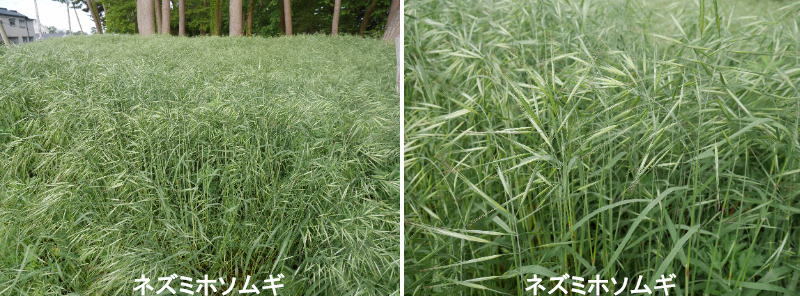 ネズミムギ、ホソムギともにヨーロッパ原産の多年草で牧草として世界じゅうで栽培されています。しかしこの2種類は交雑しやすく、その結果誕生したのがこのネズミホソムギです。ネズミホソムギも「ハイブリッドライグラス」と呼ばれ、同様に牧草として広く利用されています。初夏を中心に、茎の先に30センチメートルほどの長さの穂が1本つきます。ふつう穂は枝分かれしませんが、エダウチ型と言って、さまざまな枝分かれが見られることがあります。ふつう小穂の先には芒があります。ただ芒の出具合は株によって、また同じ株でも小穂によってずいぶん異なります。世界中の畜産を支える重要な牧草です。一方で増える力がとても強く、イネ科花粉症の主要な原因植物にもなっています。この点に留意しつつ有効に活用していきたいところです。ネズミムギ(イタリアンライグラス)、ホソムギ(ペレニアルライグラス)とも、ヨーロッパ原産の多年草で、牧草として広く栽培されています。一般に小穂に1センチメートルほどの芒があり、長さが揃っていて、次に出る若葉が若芽の中で渦を巻くように収まっています。一方のホソムギは小穂に芒はなく(稀に短い芒あり)、次に出る若葉は若芽の中で2枚に折りたたまるようにして入っています。