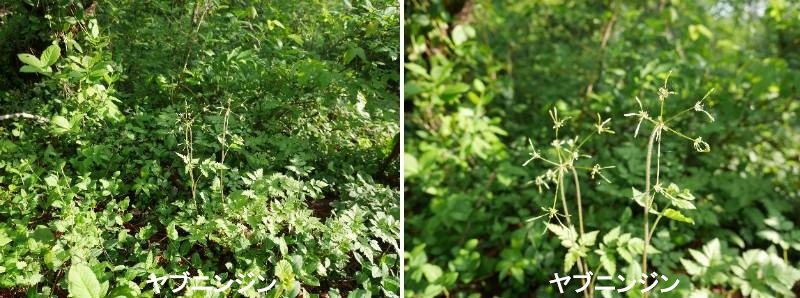 ヤブニンジン(藪人参)はセリ科ヤブニンジン属の多年草です。新潟県直江津市ではウマゼリとも呼んでいます。北海道〜九州の林のふち、竹やぶなどの日陰に生えています。高さ30〜70cm位に成長します。葉は長さ7〜30cmの2回3出羽状複葉で、薄くて柔らかく、裏面は白っぽいです。小葉は卵形で、ふちには粗い鋸歯があります。枝先から複散形花序をだし、白色の小さな花をまばらにつけます。花柄は細長く、少総苞片はそり返っています。花には両性花と花柱が退化した雄花とがあります。果実は長さ約2cmのこん棒状で、上部はふくれ、基部は細くなっています。隆起線には上向きの刺毛があり、花期は4〜5月です。