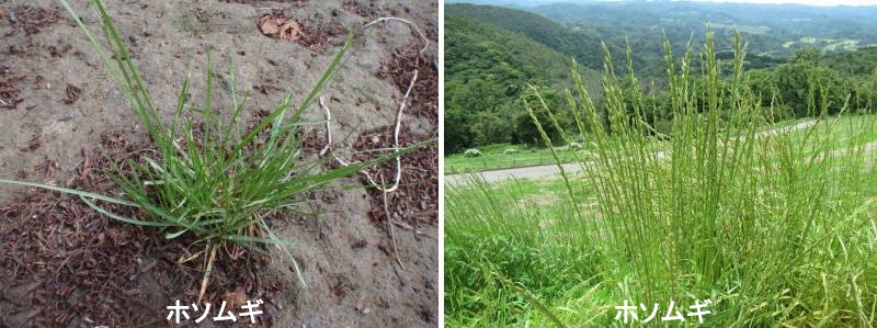 ホソムギは牧草あるいは種子吹き付けによる緑化などに利用される多年草です。同属のネズミムギなどと自然交雑あるいは交配によって品種改良され中間的なものが広く分布しており、同定の困難な種です。緑化などではペレニアルライグラスと呼ばれ、牧草種子吹き付けにもよく利用されています。越年草で、生育期間ほぼ通年です。種子で繁殖します。ヨーロッパ原産の帰化植物で牧草や砂防用植物として各地で栽培されたものが野生化して、現在では道端、あき地などに広がっています。ほぼ1年中発生しますが多くは秋に発生して幼苗で越冬します。茎はそう生し、高さ30~70㎝になります。葉は多くは根ぎわから出るが茎にもつきます。葉は細長い線形で、基部は鞘となって茎を包んでいます。葉の表面は滑らかで、5~8月に細長い穂を出します。小穂は扁平で穂軸に2列に並んで付き、小穂はネズミムギと違いのぎがないので区別できます。