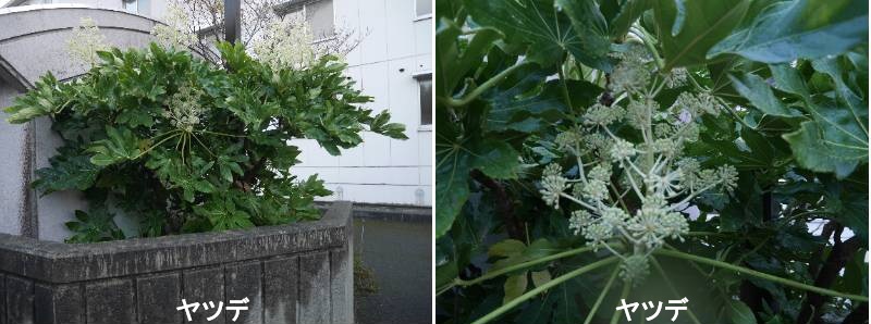 ヤツデは、日本原産の常緑低木で、本州の福島より南~沖縄まで広く分布します。日本では古くからごくふつうに親しまれており、庭園や公園にもよく植えられています。ヨーロッパには1838年に入ってきたという記録が残っており、今では世界で広く栽培されています。厚みのある葉は深い緑色で通常7~9、多くて11くらいに裂けます。裂ける数はたいがい奇数です。表面には光沢があり葉の縁は細かいギザギザになっています。その特徴的な葉姿から、テングノハウチワの別名があります。冬も落葉せずに大きな葉が茂っているので目隠し用の庭木として利用される他、大きな手のような葉が人を招くという「千客万来」の縁起を担いで玄関先や門の脇に植えられることもあります。また、大きな葉っぱが魔物を追い払うとも言われています。日陰でも元気に育つので、あまり日当たりの良くない場所にも植えることができます。冬、球状にまとまった白っぽい花がたくさん咲き果実が付きます。果実は翌年5月頃に黒く熟します。