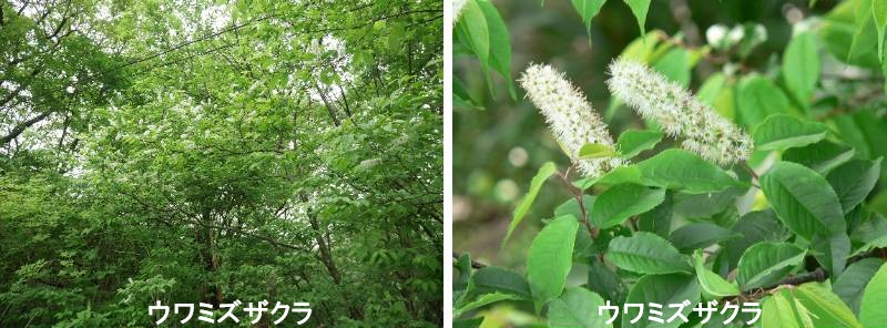 ウワミズザクラの花だけ見ると、とてもサクラの仲間とは思えません。コップを洗う細長いブラシのような白花を咲かせます。ソメイヨシノもヤマザクラも花を落とした頃に開花する異色のサクラです。果実は、食用になります。また、鳥類やツキノワグマも大好物で、その実を食べて移動した後、糞とともに種を散布し、分布を拡大してきたことから、山野の至る所に自生しています。 古代、シカの肩甲骨の裏に溝を彫り、この樹皮で焼き、溝の周辺に生じる割れ目を見て吉凶を占ったと言います。この裏溝が転じて「上溝桜(ウワミゾザクラ)」と書き、それが転訛してウワミズザクラと呼ぶようになりました。古名は、古事記の「天の岩戸」に出てくる波波迦(ははか)と言います。