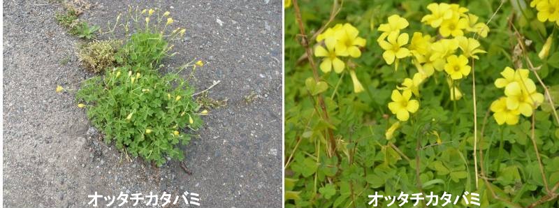 オッタチカタバミは、国内では1962年に京都で発見されたのが初記録です。現在は身近な場所でごく普通に見られ、乾燥した荒れ地環境でも生育可能なため、幹線道路の路傍など、植物が育つには過酷と思えるような場所にも見かけます。在来種のカタバミに似ていますが、茎は太くて立ち上がります。草丈は10センチメートルから50センチメートルほどになり、葉は茎の節の部分に集まってつくような傾向があります。葉のつけ根にある「托葉」は小さく、茎にはかかりません(カタバミの托葉は大きく茎にもかかる)。花後にできる果実の柄は斜め下を向く傾向が強く現れます(カタバミの果実の柄は横から斜め上)。果実は熟すと軽く触れただけで勢いよく弾け、中のタネを飛ばします。またタネにはエライエソーム(アリの好物)がついており、アリによって拡散されていきます。オッタチカタバミによく似たエゾタチカタバミという植物があります。これは北半球の広範囲に分布する種で、国内でも山地に自生しています。現在はエゾタチカタバミにO. stricta、オッタチカタバミにO. dilleniiの学名が充てられています。しかしこの学名の扱いについてはアメリカとヨーロッパの学者の間で論争があり、かつてはオッタチカタバミにO. strictaが充てられたこともありました。増える力が強いため、他の植物が育つ場所を奪ってしまうおそれがあります。また最近は同じ仲間のカタバミ(在来)との間で交雑が起こっており、雑種も少しずつ増えてきています。