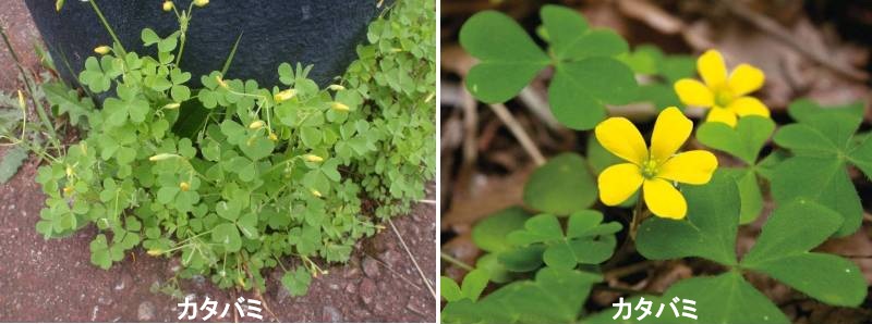 カタバミはカタバミ科カタバミ属の多年草で、日本では道端や空き地、農地などでもよく見かけます。属の植物は温帯から熱帯の地域に分布し、世界に約850種も存在しますが、日本では6種類が自生しており、さらに7種類ほどの外来種が帰化植物として定着しています。花が大きく美しいカタバミは「オキザリス」と呼ばれ、ガーデニングプランツとしても利用されています。また、横に株が増えていくので、グラウンドカバーとしても活躍します。カタバミの花言葉は「輝く心」「喜び」「母の優しさ」です。その昔、カタバミは真鍮の鏡や仏具を磨くために使われていたため、「輝く心」という花言葉がつけられました。またスペインやフランスでは「ハレルヤ」と呼ぶことから、「喜び」という花言葉の由来となっています。これは復活祭でハレルヤが唱えられる時期にカタバミの花が咲き始めることに因んでいるといわれています。和名のカタバミは漢字で「片喰」と書きます。ハート形の葉が、昔の人には一部が食べられて欠けているように見えたことに由来しています。また、カタバミは「酢漿」と書くこともあり、「酸葉(すいば)」「スイモグサ」と呼ばれることもあります。これは葉や茎にシュウ酸を含んでいるため酸っぱい味がするのが由来です。このほかに「黄金草(おうごんそう)」や「鏡草(かがみぐさ)」、「銭みがき(ぜにみがき)」とも呼ばれます。いずれも、カタバミに含まれるシュウ酸を利用して、カタバミの葉で古い銅製品を磨くと錆が取れピカピカになることが由来です。