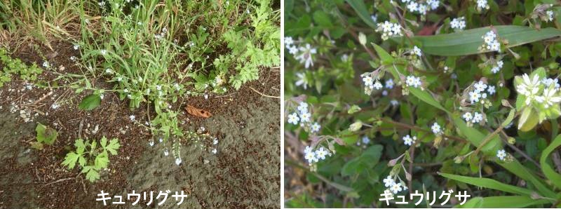 キュウリグサは、身近な場所のいたるところにごく普通に見られる1年から越年草です。秋に発芽し、ロゼットの状態で越冬し、春に開花結実して枯れるというサイクルを繰り返しています。穂の先はくるんと巻いています。花が咲き進むにつれて巻きがほどけるようにしてのびていき、最終的には20センチメートルから30センチメートルほどの長さになります。このように巻いたような穂のつきかたをサソリ状花序または巻散花序と言います。穂の部分には葉はありません。花は直径2ミリメートル程度と小さいのですが、よく見るととても可愛らしい姿をしています。花びらは水色で、中心付近はほんのり黄色になっています。つぼみはしばしばピンク色になります。キュウリグサのキュウリ、これはあの野菜のキュウリのことです。しかし見た感じはどこにもキュウリの要素がなく、疑問に思う方も多いかもしれませんね。では、どこがキュウリなのか…。葉を揉んで匂いを嗅ぐと、そこに答えがあります。そう、キュウリのような匂いがするのです。草むしりをしている時にふとキュウリの匂いが漂ってきたら、近くにキュウリグサがあるかもしれません。