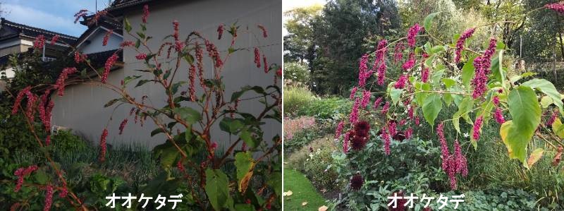 オオケタデは、ナデシコ目タデ科イヌタデ属の一年生草本で、別名でオオベニタデ、ベニバナオオケタデともよばれています。同じタデ属のイヌタデやオオイヌタデに似ていますが、本種はそれらよりも大型で葉幅も広く、花の紅色が鮮やかです。インド、マレーシア、中国など熱帯アジア・東南アジアの原産です。日本へは観賞用として江戸時代にアジアから渡来し、栽培されました。現在では野生化して北海道から沖縄まで分布し、河原や道端、空き地、土手、野原、荒れ地などに生えています。日当たりがよく、やや湿ったような場所を好み、畑のわきや、人家のまわり、水辺でも見られます。大型の一年草で、茎は直立して草丈は1~2m、茎の太さは径3cm)にもなるります。茎など全体に斜上する細かい毛が多く生えていて、この植物の名の由来になっています。葉は、緑色をしており、長さ10~25cm、幅5~15cmで卵形から広卵形、幅広で先は尖り、基部は円形または心形、両面に短毛が密生し、葉柄が長く互生します。