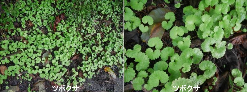 ツボクサは、山野の道端や広場に生えるセリ科の小型の多年草です。葉は根生し,直径2~5cm円形でスミレの葉を思わせます。葉の基部の腋(わき)から長い走出枝を地表にのばし,その先に新しい株をつくります。夏には葉の基部から短い柄のある小さい散形花序を出し,淡紫色を帯びた小さい花を数個つけます。花には5枚の花弁,5本のおしべ,2本の花柱があり,子房は下位で,左右から扁圧された球形で緑色の果実をつけ,熟すと2分果に分かれます。本州の関東地方以西,四国,九州,中国から熱帯域のインド,東南アジア,アフリカにわたって広く分布しています。マレーでは野菜の代用として食用にされ,東南アジア方面では葉をもんで傷口や皮膚のただれにはったり,下痢の薬として用いられることがあります。