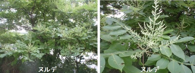 ヌルデは北海道から九州までの山野に生えるウルシ科の落葉小高木で、高さ5mほどに成長します。葉は枝先に互生して広がる奇数羽状複葉で長さは30cmほどあり、葉軸は小葉の間で翼を持っています。この特徴が、ウルシやハゼノキと区別する目印になります。ヌルデは花が咲いた後に、小さな平たい円形の核果を結びます。短い毛が密生している実が熟すと白い粉を一斉にふき、毛を固めて白い塊となります。この実をなめると、塩味と酸味を感じます。考古学者の藤森栄一氏は、古代において、これは海から遠い信州人の塩であったと推理しています。ヌルデの葉にはヌルデノフシムシが寄生して病瘤がよくできます。これを秋に採取して蒸し、中の虫を殺して乾燥したものは「膚子(ふし)」または「五倍子(ごばいし)」と呼ばれています。