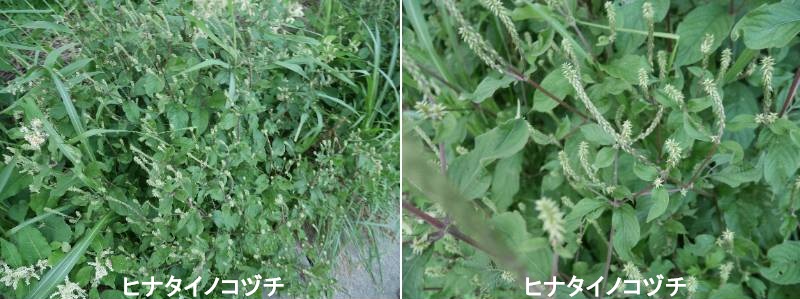 ヒナタイノコヅチは、道ばたや野原など、いたるところにごく普通に生育している、頑丈で根の張りの良い多年草です。特に日当たりの良い場所を好む傾向があります。夏から秋にかけて、茎の先に緑色の花の穂をつけます。花の穂がつく部分の茎は白い毛が多く生える傾向があります。花後にできる果実には2本の刺があり、これがクリップのように服の繊維に引っかかってくっつきます。冬になると地上部は枯れ、根で越冬します。初冬のうちは、枯れた茎の中にある水分が凍結して、白く平べったい氷が皮を突きやぶって、にゅるっと伸びてくることがあります。また、枯れる前に葉が赤く色づくこともあります。