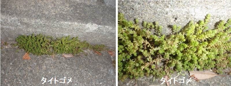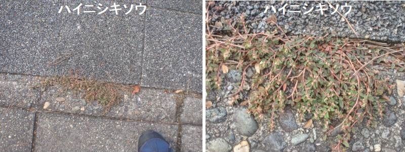 ハイニシキソウはアメリカ原産の帰化植物です。世界の熱帯・亜熱帯に広く帰化しているといいます。道ばた、荒地などによく生えます。ハイニシキソウの茎は根もとから多くの枝を分け地面をはいます。葉は長さ4~8 mm、巾4.5~5.5mm、まるみをおび、上面の暗紫色の斑紋はない。果実は上から見ると正三角形で、径1.3mm、稜にそって長い毛がある。種子に深い横しわのあるのも特徴です。花期は夏~秋です。沖縄や小笠原ではほぼ通年。近畿以西の鉄道沿線や港付近の道ばたや空き地で見られます。