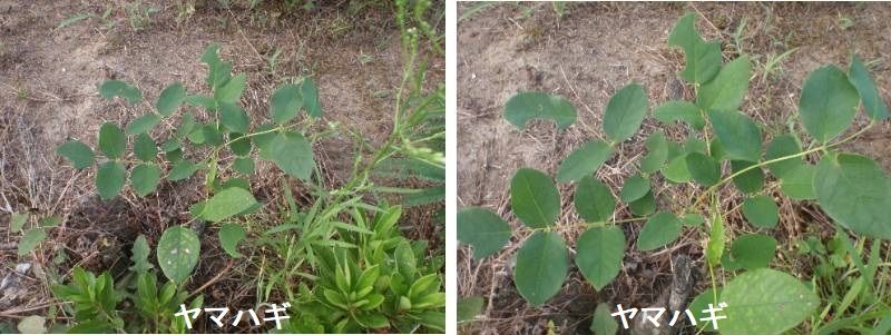 アジア原産で日本では北海道から九州まで日本各地の山野に生えるマメ科ハギ属の落葉低木です。各地の山野に生える高さ2m程に成長します。葉腋から長い花柄を伸ばし花をつけます。紅紫色の蝶形花で、翼弁の色は濃く、ほぼ竜骨弁と同じ長さで、少し内側に曲がります。長い葉柄があり、広楕円形の小葉は先端は円形です。花柄も長く、葉の間から花穂が突き出しているのが特徴です。秋の七草に詠まれているハギは本種と言われています。ハギの仲間は北半球に約60種ありますが、日本にはヤマハギに代表され、木として扱われる8種と、メドハギに代表される、草のハギ4種が分布しています。ハギという植物はありませんが本種が最も一般的であるため、単にハギという場合はヤマハギを示す事が多いです。