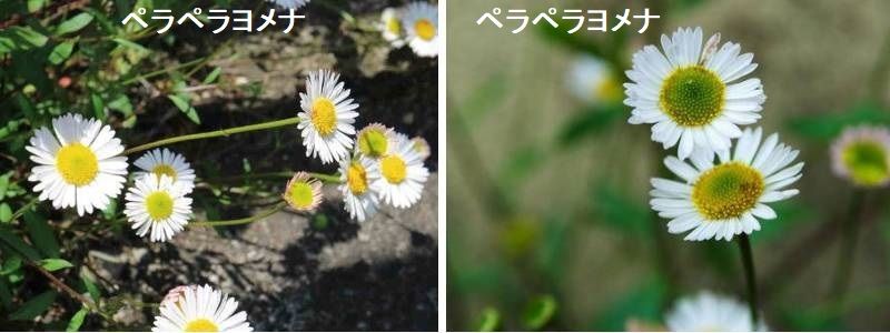 葉は互生し、長さ5~10cmで、やや光沢があります。 茎は上部で分枝して、高さ1m前後になります。名は葉が薄くペラペラで、ヨメナのような花をつけることからついたものです。ヨメナの名がつくがヨメナの仲間のシオン属ではなく、ムカシヨモギ属です。別名ペラペラヒメジョオン、メキシコヒナギクと云います。花卉としては源平小菊、無休菊、属名そのままのエリゲロンの名で流通しています。中央アメリカ原産で花卉として栽培され、野生化している長さ20-50cmになる多年草です。