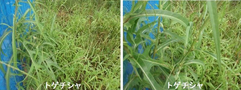 トゲチシャはキク科の1〜2年草で、ヨーロッパの原産ですが、今ではほぼ全世界で見られるようです。学名を「ラクツカ・スカリオラ」といい、和名は「トゲチシャ」又は「アレチヂシャ」とつけられています。日本では1949年に初めて北海道で採集されましたが、現在は日本全域に広がっています。市街地や草地に多く、農耕地にはあまり侵入しないようですが、関西地方では道路の緑地帯や街路樹の植樹帯などに群生しています。茎は直立し、葉は無柄で基部は耳状に茎を抱いて、ねじれて垂直につき、葉身は羽状に深く切れ込むため、確かに形は面白いかもしれませんが、茎や葉に固い刺(とげ)があるので取扱いはやっかいです。なお、葉に切れ込みのない変種も帰化していて、「マルバトゲチシャ」という和名がつけられています。