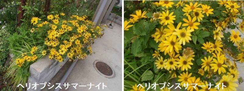 ヘリオプシス(キクイモモドキ)は宿根ヒマワリ(ヘリアンサス)と共に、姫ヒマワリと呼ばれています。有名な八重咲き品種の「旭(あさひ)」もヘリオプシスです。サマーナイトは一重咲きの人気品種で、濃い黄色の花びら、オレンジに染まる花心にチョコレート色の茎など、個性的で野性的な品種です。夏に咲くキク科の宿根草の多くは、黄色のお花を咲かせます。たいていは緑色の茎に緑の葉なので、サマーナイトのチョコレート色は良いアクセントになります。成長が早くよく伸びるので、梅雨時期の一番花は切り花として楽しむのもよいと思います。お盆過ぎには返り咲いたお花が楽しめるので、切ってお部屋に飾ってはどうでしょうか。
