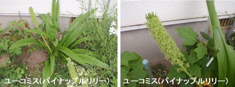 ユーコミスはギリシャ語で「きれいな髪の毛(髪飾り)」を意味し、花穂の頂部についている苞葉(ほうよう)の様子に由来しているものとされています。 また、その花姿から「パイナップルリリー」とも呼ばれています。ユーコミス属には10種類ほどがあり、アフリカ南部の夏季に降雨が見られる地域に自生しています。ユーコミス属には、ユニークな花姿と、直線的な草姿で園芸的に観賞価値が高い種類が多くあります。花だけでなく、葉に赤紫色や斑の入ったものもあり、開花までの期間も含めて長い期間楽しめます。コモサ種や、コモサ種とパリディフロラ種の雑種、特に亜種ポールエヴァンシーの雑種からなる園芸品種は花穂が大きく葉も雄大で、庭に植えるとたいへん存在感があります。花茎が長く花もちがよいので切り花にも向きます。