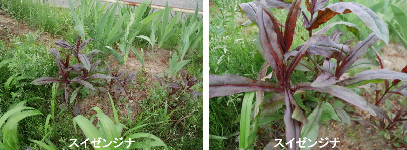 スイゼンジナは、キク科ギヌラ属の熱帯アジアを原産とする多年草です。日本には18世紀中頃に中国から伝来し、平賀源内の著書に「スイゼンジソウ」として記載があり、その変種がスイゼンジナであろうと言われています。名のとおり熊本で野菜として栽培され、水前寺の茶席などで使われていたようです。現在では、4月から降霜まで随時若芽を収穫し、お浸し、サラダなどに葉菜類として利用されています。葉は互生し先が尖った長楕円形で縁に切れ込みがあり長さ10㎝程度、やや多肉質で、表面は濃緑色、裏側は紫色をしています。茎もやや多肉質で夏の間は盛んに枝分かれして、地を這うように生育し、草丈は30~60㎝になります。5月頃、枝先にアザミに似た黄赤色の花を付け、腐臭を発します。