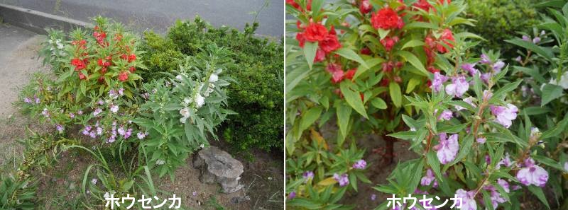 ホウセンカは中国名「鳳仙花」をそのまま音読みにしたものです。花の形を鳳凰が羽ばたいている姿になぞらえて付けられた言われています。花の咲いた後に、茎にぶら下がるように少しゆがんだラグビーボール型の果実がたくさんつきます。果実は軽く触れただけで、パチンとはじけてタネを広範囲に飛ばします。属名のインパチェンスは「ガマンできない」という意味で、この性質に由来します。インドからマレー半島、中国南部に分布する一年草です。園芸では春にタネをまいて夏に花を楽しむのが一般的です。今では同じ仲間のアフリカホウセンカ(インパチェンス)に座を譲った感がありますが、盛夏に咲く草花として古くから親しまれています。