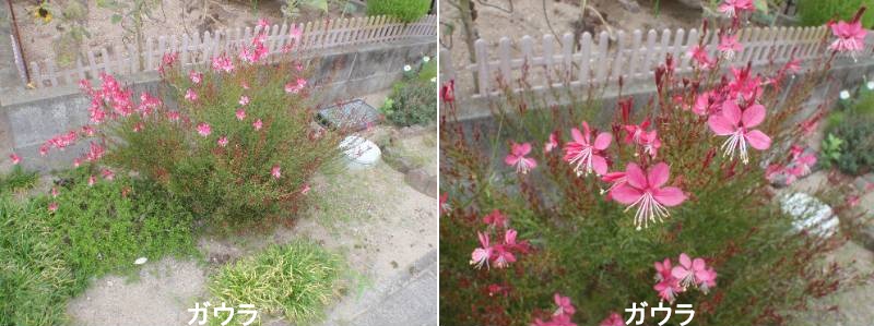 ガウラの穂状に咲く小花が風に揺れる様子は、白い蝶が群れて飛んでいるようで、やさしい風情が感じられます。性質は強健で耐暑性もあり、初夏から晩秋まで次々と花を咲かせながら株が大きく成長していきます。花壇の背景、コンテナの寄せ植えから、広い場所での景観植物としての利用まで、幅広い用途があります。またフラワーアレンジメントでは空間を埋めるフィラーフラワーとしても使いやすい花です。花弁は4枚で、長い雄しべがよく目立ちます。1つの花は短命で3日ほどで散りますが、花つきがよく、ほとんど途切れることなく咲き続けます。ガウラ属は、北アメリカに20種ほどがありますが、観賞用に栽培されるのは本種、G・リンドハイメリで、日本へは明治時代中ごろに入ったといわれています。以前は、草丈1m以上に伸び、白花だけでしたが、近年、濃いピンクの‘シスキューピンク’の育成に始まり、複色、草丈の低いものなど、多くの園芸品種が育成され、利用されるようになりました。