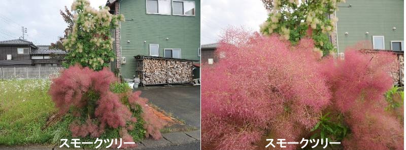 スモークツリーはウルシ属に近縁な、雌雄異株の落葉樹です。初夏に咲く花木の代表で、ヨーロッパから中国に分布します。雌木の枝先につく花序は長さ約20cmで多数枝分かれし、花後に伸びた花柄が遠くからは煙がくすぶっているように見えます。雄木は花序が短く、煙状にはなりません。横に広い円形の樹形が美しく、秋の紅葉も楽しむことができます。銅葉や黄葉の園芸品種も栽培されています。その見た目の通り、英名を「smoke tree」、和名を「ケムリノキ(煙の木)」と言い、ふわふわとして煙を巻き上げているように見えることから、この名が付けられました。