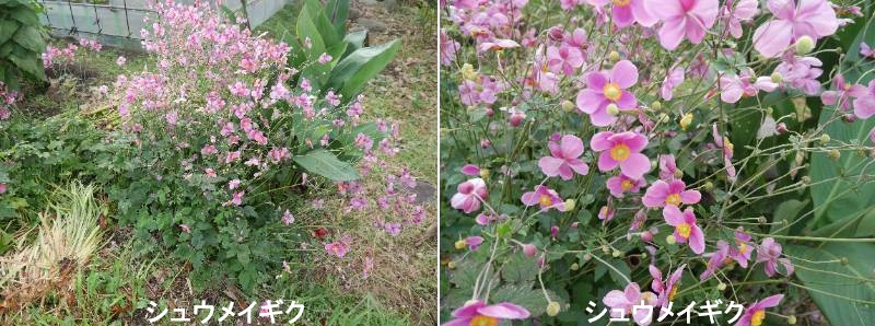 シュウメイギクは秋の風情を感じさせる優雅な花で、切り花をはじめ、花壇や鉢植えに広く利用されています。わが国へは古い時代に中国から入り、京都の貴船地方に野生化したものが見られます。これがキブネギクで、本来のシュウメイギクです。ただし、現在は類似のいくつかの種や、これらの交配種も含めて、総称的にシュウメイギクと呼ばれています。早春に咲くイチゲの類と同じアネモネ属の植物ですが、性質はかなり異なり、半常緑性の大型の多年草で、地中の根は太く長く伸びて、いたるところから不定芽を出してふえます。夏の終わりごろから花茎が伸び出し、先端にまず1輪、そしてその両わきに1輪ずつ、さらにそのわきというように順に花を咲かせます。花びらのように見えるのは萼片で、花弁は退化しています。開花後は綿毛に包まれたタネが実りますが、品種によってはタネのできないものもあります。