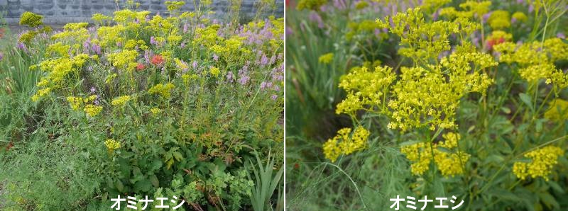 オミナエシは、日当たりのよい草原に見られる植物です。数本の茎をまっすぐに伸ばして株立ちになり、先端に多数の黄色い花を咲かせます。花房は全体で15~20cmほどの大きさがあります。葉は対になってつき、茎につく葉は細く羽状に深く裂けますが、根元につく葉はダイコンの葉に似た形です。短い地下茎を伸ばしてふえます。秋の七草の一つとして有名ですが、開花にはかなり早晩の差があり、6月から9月にかけて咲きます。花が終わっても色を保つため、かなりの期間楽しめます。切り花にすると水がひどい悪臭を放ちますが、毎日水を替えると多少はよくなります。