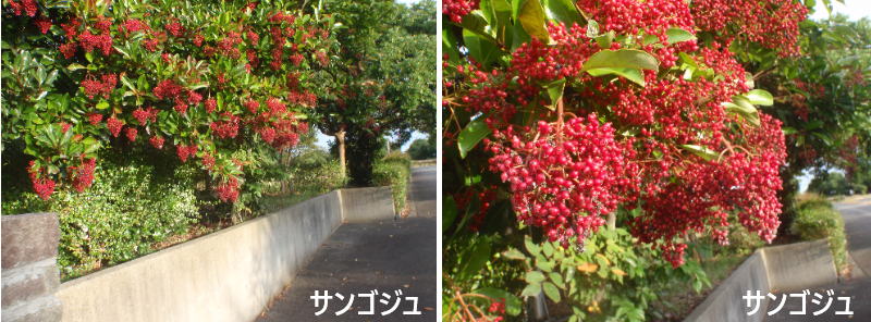 サンゴジュは、本州の関東より南、四国、九州、沖縄から台湾まで分布する常緑性の広葉樹で樹高7m~8mの小高木です(写真は東北の酒田市)。6月~7月に小さな白い花が円すい状に集まって咲き、その後だ円形の果実ができて秋になると深紅色に熟します。熟した果実と濃い緑色の葉の取り合わせが美しいです。葉は濃緑色で表面は光沢があり、全縁もしくは上半分にゆるいぎざぎざが入ります。芽吹く力が強く耐火力が比較的強いので、鑑賞する樹木と言うよりも防災や目隠しとして(生垣に仕立てて)用いられることが多いです。また、一度根付いてしまうと非常に丈夫な樹木で、排気ガスや潮風にも耐えるので海岸沿いの風よけや公園など公共用の樹木しても広く利用されています。熟した果実を海のサンゴに見立てて、サンゴジュという名前が付けられました