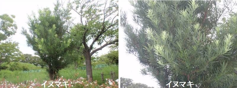 イヌマキは雌雄異株の常緑高木です。若い枝は柔らかく、刈り込みにも耐えるため、人工樹形に仕立て庭木として利用されるほか、生け垣にも使われます。開花期は5月から6月で、雄株には葉と同じくらいの長さの尾状の黄色みを帯びた雄花が、雌株には先端に胚珠(はいしゅ)のある雌花が現れます。雌花は10月ごろに成熟し、先端に緑色で白い粉をまとったようなタネができ、タネの下には卵形に肥大して暗紫色に熟した花托(かたく)が見られます。この花托は多汁の肉質で、甘く生食できます。