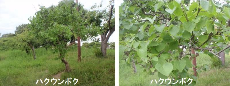 ハクウンボクは別名をオオバジシャと言いますが、チシャノキというのはエゴノキの別名なのです。ハクウンボクはエゴノキ属の植物で、エゴノキよりはが大きいため、この別名がつきました。ブドウのように、枝から垂れ下がった果実の房が特徴的です。そして、丸く大きな葉もハクウンボクを印象づけます。葉の裏側には星状毛といって、たいへん小さな放射する毛が密生していて、葉全体が白く見えます。花は5~6月。エゴノキによく似た白い花が房状につきます。学名は通常ラテン語で書かれます。ギリシャ語が用いられる場合もありますが、それほど多くはありません。ハクウンボクの学名は(スティラックス・オバシア)ですが、obassiaはラテン語では無く、日本語のオオバジシャに由来しています。珍しい例ですね。命名者はシーボルトとツッカリーニです。