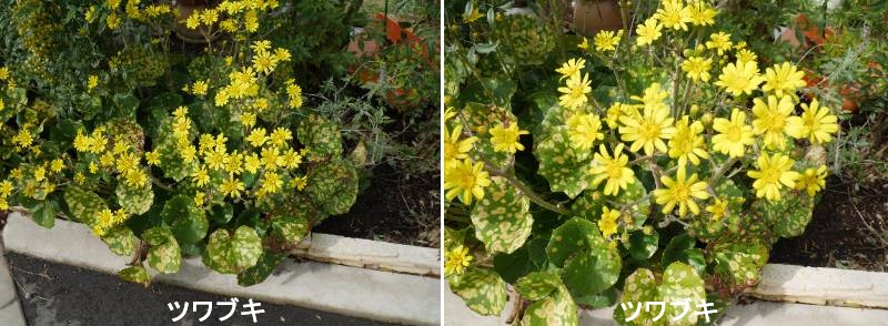 ツワブキは海沿いの草原や崖、林の縁に見られる常緑の多年草です。葉は革質でつやがあり、円くて直径20cm前後あります。新芽は茶色の綿毛に包まれていますが、成長につれて取れていきます。地下には短いワサビ状の根茎が連なり、大きな株になります。花は株の中心から出て、先端に10~30輪ほどのキクに似た、花径3cm前後の黄色い花を咲かせます。斑入りや八重咲き、丁字咲き(花芯が発達してアネモネ咲きになる品種)などの園芸品種が栽培されてきました。花色も黄色のほか、クリームホワイト、朱色、レモン色などの品種があります。秋に咲く花だけでなく、斑入りや獅子葉など葉も変化に富み、1年中庭に彩りを添える植物として古くから親しまれています。