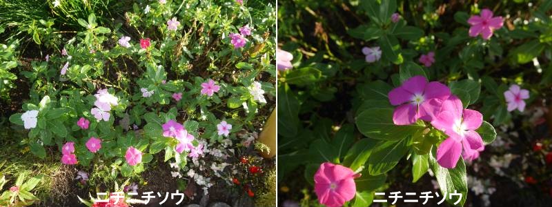 ニチニチソウは、主に夏から秋に花壇や鉢植えで楽しむ草花です。排気ガスなど大気汚染に対する耐性も強いので、道路沿いの花壇でも活躍しています。自生地では毎年花を咲かせて生長し、低木状になります。日本では霜の降りる頃に寒さで枯れることが多いので、一年草として扱います。基本は春にタネをまいて夏から秋に花を楽しみます。日本には江戸時代中期に入ってきたとされます。種々のアルカロイドを含み、薬用植物としても知られています。葉は濃緑色の細いだ円形で、表面にはツヤツヤした光沢があります。葉っぱもきれいで、花のない時期でも存外に見栄えがします。茎は直立する立性、地面を這うように伸びる這性があります。這性タイプは吊り鉢にもよく合います。