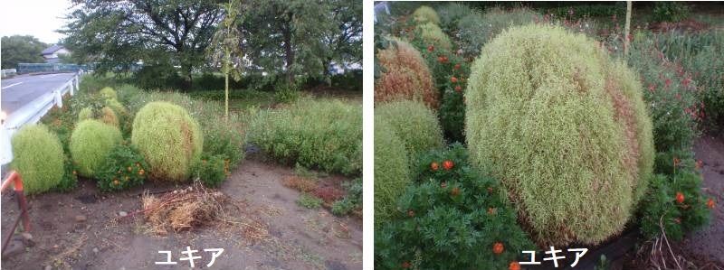 コキアは、草姿が円錐形の整った形で、繊細な茎葉が密に茂り、明るくさわやかな印象を受ける春まき一年草です。観賞期間が長く、同じ形状のまま大きく育ちます。まるで刈り込みをしたコニファーのようで、何株かをまとめて植えると特異な景観がつくれます。ホウキギの和名のとおり、刈り取って陰干しして、草ボウキをつくるのに利用されます。かつてはコキア属に分類されていたので、コキアと呼ばれていますが、今はバッシア属になっています。世界各地で野生化していて、日本でも帰化植物となっており、イソボウキの名で呼ばれることもあります。観賞用に栽培されるのは、主に変種のトリコフィラ(ハナホウキギで、コンパクトな草姿で丸みがあり、秋には美しく紅葉します。花は淡黄緑色で、小さくて目立たず、雄花雌花があります。畑のキャビアとして知られるトンブリは、本種のなかで種子の大きな系統の果実からつくられるものです。これは草丈が高く、紅葉はしません。