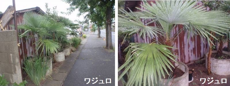 ワジュロは日本を原産とする数少ないヤシ科植物の一つです。かつて九州南部に自生し、他の樹木にない南国風の雰囲気を持つことから、明治時代以降、関東地方以西の洋風庭園を中心に植栽されるようになりました。さらにエキゾティックな庭木が普及した現代では庭園、公園に限らず民家の軒先、道端、藪の中で最も普通に見られる「ヤシみたいな木」です。一般にシュロという場合、本種と中国原産とされるトウジュロ(唐棕櫚)を区別せずに扱いますが、本種をワジュロと呼んでトウジュロと区別することもあります。シュロという名は中国名の「棕櫚」を音読みしたものです。幹(茎)は分岐せず真っすぐに伸び、枝もありません。幹の頂部に生じる葉は扇状で、何枚もの細長い小葉が集まってできています。葉柄(葉の軸)は断面が三角形です。丈夫で持ちやすく、切除した葉をそのまま箒として使うことができます。葉全体の大きさは直径150~250センチほどです。