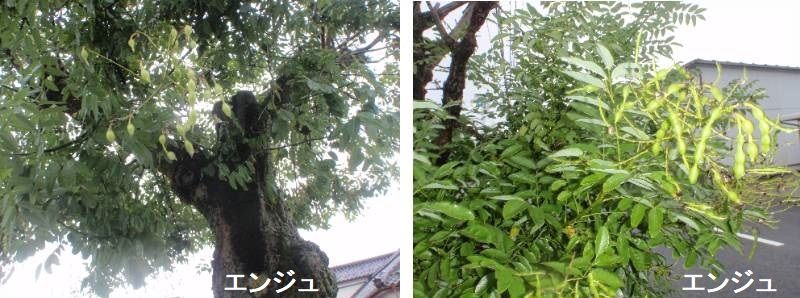 中国原産のエンジュは、奈良時代に薬用を目的に渡来した外来植物です。中国では、古くから並木に用いられていましたが、日本でも各地で街路樹に使われています。夏、枝先に淡い黄白色の小さい蝶形花を多数つけます。マメ科らしい果実は、種子と種子との間が大きくくびれています。中国では縁起の良い木とされています。生薬名は槐花(かいか)で、止血薬として利用されています。周の時代は宮廷の庭に植え、朝廷の最高位にある三公はこれに向かって座したと言われています。各家でも、子が成長して高位につけることを願って屋敷内に植える縁起の良い木とされています。三公は三塊といい、大臣のことを槐位といいました。だから、漢名は「槐」となりまはた。