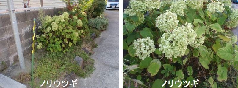ノリウツギはアジサイの仲間ですが、円錐形の花序(花房)をもつため開花時の趣は一般のアジサイと少し異なります。開花期もアジサイより遅く、花の少ない夏にはありがたい樹種です。花弁のように白く円錐花序を彩るのはしべが退化した装飾花の萼片で、雄しべと雌しべをもつ両性花には装飾花のような大きな萼片はありません。「ピラミッドアジサイ」の名で市場に出回っているミナヅキは、ほとんどの花が装飾花となり、円錐花序全体が白色で覆われます。葉は対生し、葉身の長さが5~15センチ、幅3~8センチと大形で、葉柄も2~4センチと長いことが特徴です。 花は夏で、枝先に8~30センチの白い円錐花序をつけ、花のまわりには、白い装飾花をつけます。アジサイの花は全体的に小ぶりなのに比べ、ノリウツギの花は花房が大きめです。 また、アジサイの花は手まり咲きやガク咲きのように丸い形をしていますが、ノリウツギの花は円錐状の形に集まって咲きます。 アジサイもノリウツギも、花の色の変化を楽しめる品種があります。