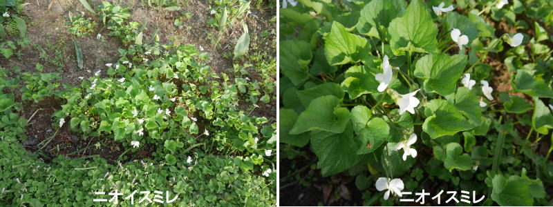 ニオイスミレ(スイートバイオレット)は、冬の花壇に欠かせないパンジーやビオラと同じ、スミレ属の多年草です。冬から早春にかけて2cmほどの香りのよい花をひそやかに咲かせて、花が少ない季節を彩ります。この開放花もタネをつけますが、気温が高くなる5月になると、葉の陰で小さな閉鎖花をつけて自家受粉したタネをつくります。どちらのこぼれダネも発芽してよくふえますが、花後に株元から伸びるランナー(ほふく茎)でも、横に広がります。日本は国土の狭さのわりに数多くのスミレ属を産することで知られますが、スイートバイオレットはヨーロッパから西アジアが原産です。紀元前320年ごろにはすでにギリシャなどで栽培され、アテネを象徴する花となっていました。イギリスではチューダー朝のころにはさまざまな色の品種が庭園で栽培されるようになり、19世紀以降、愛好家がふえるにつれて育種への取り組みが盛んに行われました。2回の世界大戦により多くの品種が失われましたが、いくつもの栽培品種が現存しています。