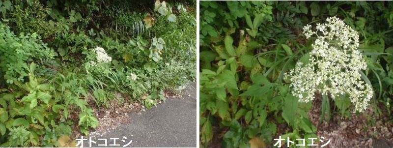 オトコエシは、北海道~九州の各地に分布するオミナエシ科の多年草です。日当たりの良い山地の林縁や野原などに自生し、秋の七草の一つであるオミナエシ(女郎花)によく似ていますが、白い花を咲かせる点が大きく異なります。別名はオトコメシ、シロオミナエシ、シロアワバナ、ツチナ、トチナなどがあります。日本以外では中国や朝鮮半島に分布しています。オトコエシ(男郎花)という名は、本種の茎がより太く、葉がより厚いことなど、全体に逞しい印象を持つことに由来します。現代的なネーミングではないですが、オミナエシとの雑種で薄紅色(あるいは淡い黄色)の花が咲く、オトコオミナエシなる現代的な品種もあります。開花は7~10月で、茎の上部に傘状の大きな花序を作り、そこに花冠が五つに裂けた白い小花を密生させます。花の後にできる果実には団扇型の羽根があり、風によって拡散されます。