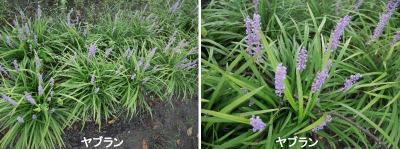 ヤブランは、日本各地の林床などで普通に見られる常緑性の多年草です。ほぼ一年中同じ草姿を保ち、性質が強く、丈夫で手のかからない植物なので、古くから緑化や造園の植栽材料として広く利用されています。耐寒性と耐暑性が強く、日なたから日陰まで幅広い環境に適応し、病害虫の被害もほとんど見られず、土質もあまり選びません。革質の細長い葉は、しなやかで堅く、8月から10月には長い穂を伸ばして、青紫から白色の花を咲かせます。ジャノヒゲに似ていますが、ジャノヒゲは青紫の実がなり、ヤブランは黒い実がなるので区別できます。ヤブラン属には5種があり、日本には、ヤブラン、ヒメヤブラン、コヤブランの3種が自生しています。斑入りや花色の異なるものなど20ほどの園芸品種があります。最もポピュラーで栽培や流通の多いのは、明るい黄色の縦縞が入る斑入りヤブランで、ゴールド・バンデッドとも呼ばれます。